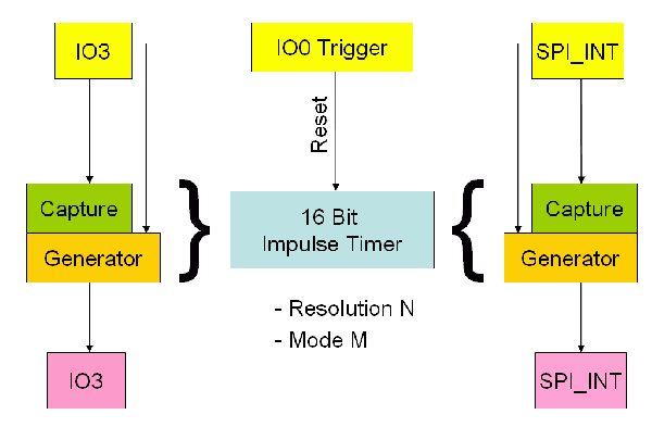 The impulse module is divided into two modes, the unsynchronized mode and the IO0 synchronized mode. Both, IO3 and SPI_INT, can either work in unsynchronized or in IO0 synchronized mode.